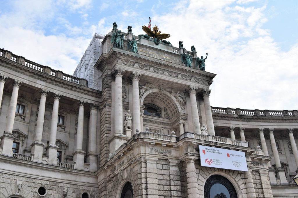 Puolikaaressa seisova jylhä rakennus on Neue Burg, jossa toimii kirjasto ja museoita. Se on Hofburgin palatsin uusin siipi, mutta keisarillisia huoneita päästääkseen katsomaan on lähdettävä Neue Burgilta vasemmalle sisäpihalle, josta mennään ulkoa päin huomattavasti vaatimattomamman näköiseen siipeen.