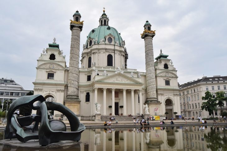 Minä tunnustaudun matkoilla kirkkobongariksi, ja Wienissä ensimmäinen löytö oli valkoinen barokkikirkko Karlskirche. Sen vaikuttavuutta lisää kirkon edustalla oleva lampi, josta Karlskirche peilaa itseään.